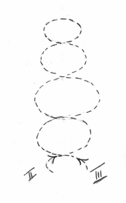 The second force which here comes into consideration is one which chiefly comes to expression in human speech. We talk, or least we can talk. There is always a certain impulse in articulate speech. A certain centrifugal force lies in the air we breathe out when we speak. The spiritually-scientific investigator sees this force as slung round the first line. It has essentially a spiral form, twining around the vertical force. This force alters somewhat the pure force of repulsion; it brings it into play. Not only is this active, the third force must also be reckoned with, which proceeds from the following. Whereas speech develops a certain centrifugal force in an outward direction, thought, through which man is distinguished from the animal, works against this force which comes to expression and speech. This constitutes the third force. If we wished to draw at, we might do so in the following manner (see diagram). Through these three forces: the vertical force, the force working in speech and the force working in thought — the particles of a human corpse are slowly and gradually carried out in the Universe.