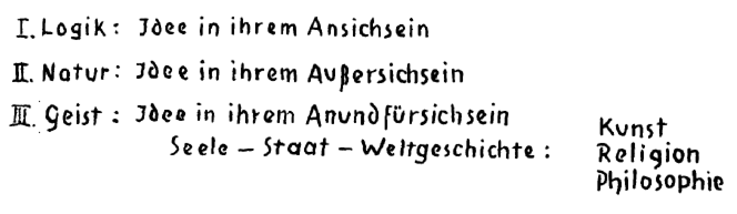 Die drei: Kunst, Religion und Philosophie, wenn sie im Menschenleben auftreten, stehen nun über Staat und über Weltgeschichte, aber sie sind doch nur die Verkörperung der reinen Logik, sie sind die Verkörperungen der abstrakten Ideen. In der Kunst stellen sich diese Ideen, die vor der Erschaffung der Welt als Logik existiert haben,