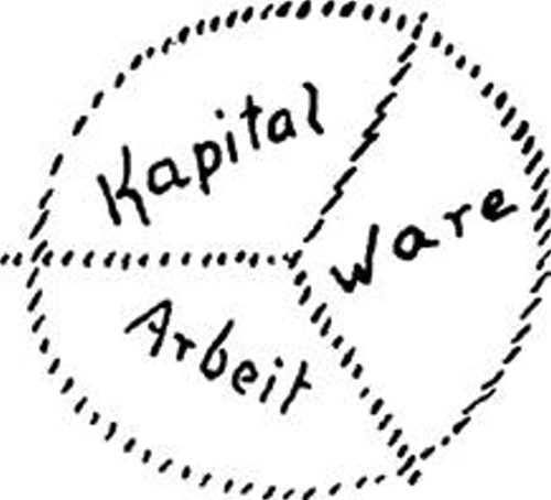 Wenn Sie dieses Schema nehmen, wenn Sie nicht die drei begriffe untereinander schreiben, sondern wenn Sie sie so schreiben, Wie ich sie in dieses Schema hineingestellt habe, dann können Sie von diesem Schema, wenn Sie es mit all den Begriffen durchdringen, die in meinem Buche stehen über die Dreigliederung, sehr viel lernen. Denn es bestehen Beziehungen hin und her von Arbeit zu Ware, von Ware zu Kapital, indem das Kapital die Ware kauft; es bestehen Beziehungen zwischen Arbeit und Kapital und so weiter, nur müssen Sie sie in dieser Weise anordnen, die drei Begriffe. (Siehe Schema.)