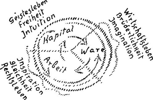 Dazu ist notwendig, daß intuitive Begriffe in dieser Gesellschaft verbreitet werden. Diese Begriffe, die Sie finden in meinem Buch «Die Kernpunkte der sozialen Frage» über das Kapital, die werden nur in einer Gesellschaft erblühen, die empfänglich ist für intuitive Begriffe. Das heißt: Es wird sich hineinstellen das Kapital in den sozialen Organismus, wenn man wiederum zugeben wird, daß in den Menschen Intuition sein soll. Die Ware wird sich in der richtigen Weise hineinstellen, wenn man zugeben wird, daß Imagination sein soll; und die Arbeit wird sich in der richtigen Weise hineinstellen, wenn man zugeben wird, daß Inspiration sein soll.