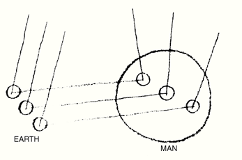 Now we have seen a connection between Astronomy and the substances of Earth; also between the Earth and human metabolism; and again a direct influence of the solar and celestial events upon man himself. In man we have a kind of meeting of what comes directly from the Heavens and what comes via earthly substance. Earthly substances work on the human metabolism, while the celestial influences work directly upon man as a whole. In man there meet the direct influences for which we are indebted to the solar life, and those influences which, passing indirectly through the Earth, have undergone a change by reason of the Earth. Thus we can say: The interior of the human being will become explicable even in a physical, anatomical sense as a resultant of cosmic influences coming directly from the Universe outside the Earth, and cosmic influences which have first passed through the earthly process. These flow together in man (Fig. 4).