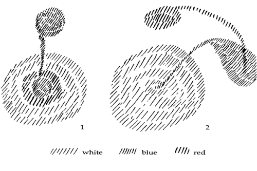To illustrate the difference I will draw it schematically. Let this be the yogi (first drawing, white lines). He developed a strong feeling of his ‘I’ (red). This enabled him to remember what he was, within a soul-spiritual environment, before he descended to earth (blue). He went back on the stream of memory.