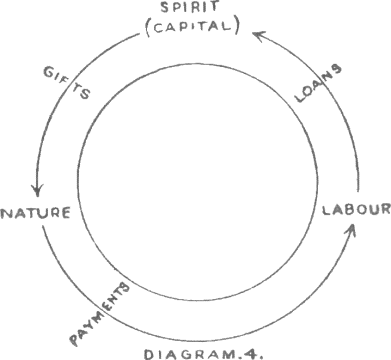 The second thing, which plays a similar part to payment, is the thing to which I drew attention yesterday. It is Lending. This, as I said, does not interfere with the concept of payment as such. Lending, once more, is an altogether different fact, a fact which simply exists. If I have money lent me, I can apply my Spirit to this loaned Capital. I become a debtor; but I also become a producer. In this way, lending plays a real economic part. If I have intellectual or spiritual capacities in some direction, it must be possible for me to obtain loaned Capital. No matter where I get it from, I must have it. Thus in addition to payment there must be loan (see Diagram 4). Here then we have two very important factors in the economic process: Payment and Loan.