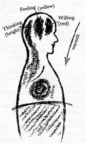 This shows that man becomes warmer from his head downward and colder from below upward. This is very interesting. The human being actually is warmed downward from above. With fever we are concerned with our head. If there is an inflammation in the big toe, we produce the ensuing fever with the head. It is interesting that what lies farthest down is regulated by the foremost parts of the brain. Just as in the case of the dog, whose tail is regulated by his nose, so it is with the human being. If he struggles with a fever in his big toe, the activity that begets this fever lies entirely in the front of his brain. It is no slight to his dignity that, if man has an infection in his big toe, the fever originates entirely from the front, from a point above his nose. The human being thus always becomes warmer from above and colder from below.