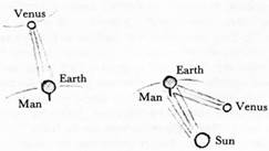 So these doctors began to observe the stars and found that in those times when these typhoid-like illnesses took a good course, the planet Venus always stood in such a position that it was blocked by the earth. If the earth is there (see sketch on left), Venus can be located here. If a person is located there on the far side of the earth, no rays from Venus reach him. Since the light of Venus can't pass through the earth, the earth covers Venus for him. The ancients, of course, recognized this, since they could not see Venus, as it was blocked by the earth. Now, they continued their observations and discovered that the prognosis was good for a person ill with typhoid in the times when Venus was blocked by the earth. When Venus was not blocked, however, the typhoid patient was subject to Venus's light in addition to sunlight (see sketch on right). Then the prognosis was bad; the head became dizzy, and the typhoid could not be cured.