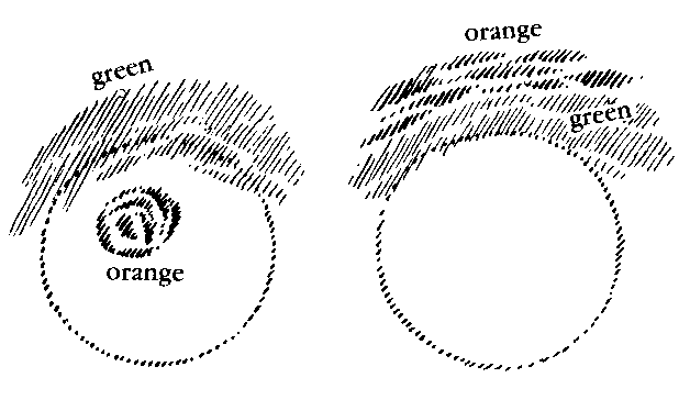 All this belongs to a right conception of the Easter thought. But what would this Easter thought be if it could not become living! It was possible in ancient times to connect the right feeling awareness with the thought of the winter solstice only because they had on the other hand the St. John's thought. Schematically drawn: If one had the earthly with its deeply concealed winter nature (orange), then its counterpart was what in summer lay in the super-earthly periphery (orange). Both were to be reached only through initiation, yet they were connected by what was in the atmosphere surrounding the Earth, in the Earth's periphery (green), Christmas calls for St. John's. St. John's calls for Christmas. Man would rigidify under the influence of the Ahrimanic powers if he could not be exposed to the loosening Luciferic powers, who again give wings to thought, so that it need not remain rigid but can thaw again under the influence of the light.