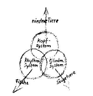 Auf diese Weise bekommt man den Menschen als eine Zusammenfassung dreier Systeme: Kopf System, Brustsystem, Gliedmaßen-StoffWechselsystem; die Tierwelt als einseitige Ausbildung entweder des einen oder des anderen Systems. Niedere Tiere, zum Beispiel Schalentiere, entsprechen also dem Kopf System; die anderen lassen sich aber auch in einer gewissen Weise dadurch betrachten. Dann Gliedmaßentiere: Säugetiere, Vögel und so weiter. Brusttiere, die also das Brustsystem vorzugsweise ausgebildet haben: Fische, und was ähnlich noch den Fischen ist, die Reptilien und so weiter. Man bekommt das Tierreich