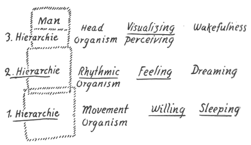 Thus, when we visualize the human being as he confronts us in earth life, a threefold membering of his organism is observable: the head organism, the rhythmic organism, and the motor organism. That is a schematic division. Each member belongs in turn to the whole man. Visualizing is bound to the head organism, feeling is bound to the rhythmic organism, and willing to the motor organism. Our state while visualizing is wakefulness, while feeling is dreaming. Our state in which willing, in which the will impulses take place is sleep, even during our waking life.