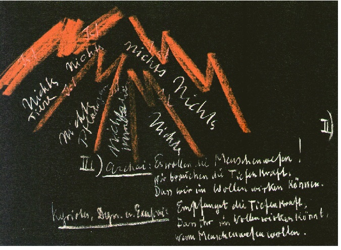 And now we look back at the faithful Guardian of the Threshold, who stands at the abyss of being. He doesn't speak now. He spoke from out of the darkness. He spoke when we first felt the brightness. He spoke when the darkness [in the stenography “brightness” — possibly an error.] was brightening for us. Now, as we stand shaken by the great truth “only spirit is”, he stands there speechless, pointing above to where the beings of the higher hierarchies speak to each other. And with presence of mind we think for a moment: Below in earthly life we perceived the impression made on us by minerals, by plants, by animals, by physical human beings; we heard what the clouds say, what the mountains say, how the fountains ripple, how the lightning flashes, how the thunder rolls, what the stars whisper about cosmic secrets. That was our experience down below. Now beyond the abyss of existence all that is silent. Now we are witnesses to the gods speaking to each other. The whole choir of Angeloi begins to speak.