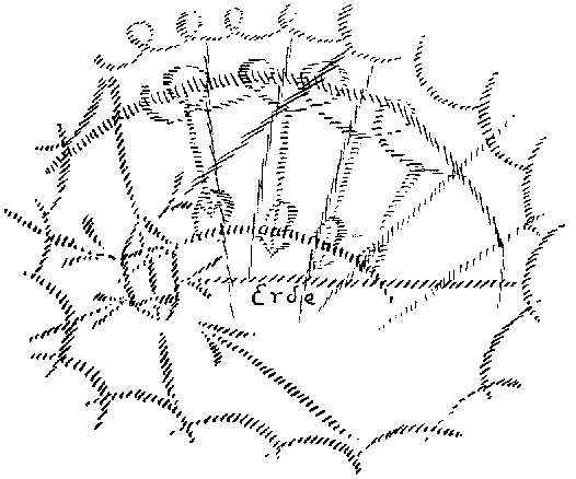 Wir müssen durch die Erde durchschauen. Das heißt, sie ist nicht da. Wir müssen weiter schauen, weil sie nicht da ist. Und wir sind genötigt, für die Mineralien jetzt nicht nur das zu schauen, was über uns ist, sondern den ganzen Umkreis zu schauen. Die Erde muß wie weggelöscht sein. Wir müssen unten dasselbe schauen wie oben, westwärts dasselbe wie ostwärts (siehe Zeichnung S. 52).