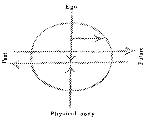 That is the only way to account for all the psychic phenomena involved. You will always be able to cope with these if you assume a current running at right angles to the other two, to the one from the past to the future, and to the one from the future to the past. That is the current corresponding to the human ego element itself.