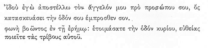 (Idou egÅ apostellÅ ton angelon mou pro prosÅpou sou, hos kataskeuasei tÄn hodon sou emprosthen sou, PhÅnÄ boÅntos en tÄ erÄmÅ: Hetoimasate tÄn hodon Kyriou, eutheiÄs poieite tÄs tribous autou.)